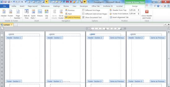 Chúng ta phải để cho MS Word 2010 hiểu rằng văn bản của chúng ta có 2 sections. Sau đó chúng ta cho MS Word 2010 hiểu rằng headers và footers của những phần này độc lập nhau. Cuối cùng là đánh số trang cho từng phần.